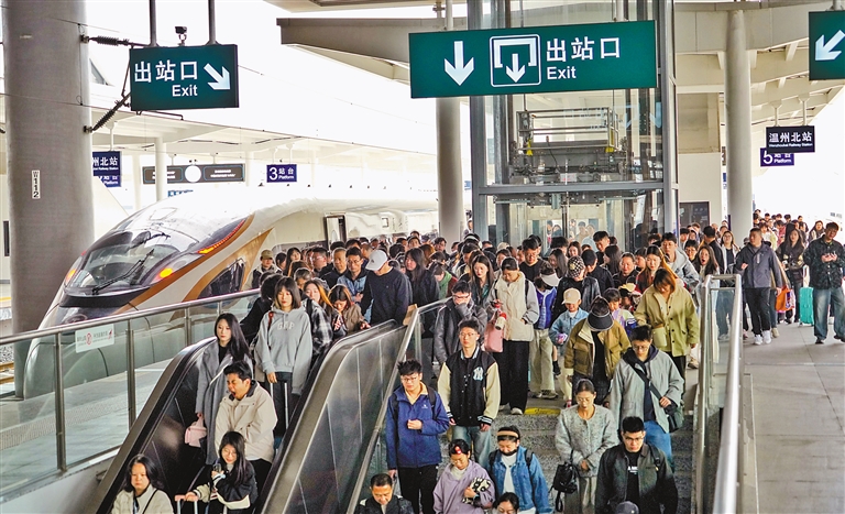 4月4日,在浙江省温州北站,抵达的乘客提着行李有序离开站台。 新华社发(苏巧将 摄)