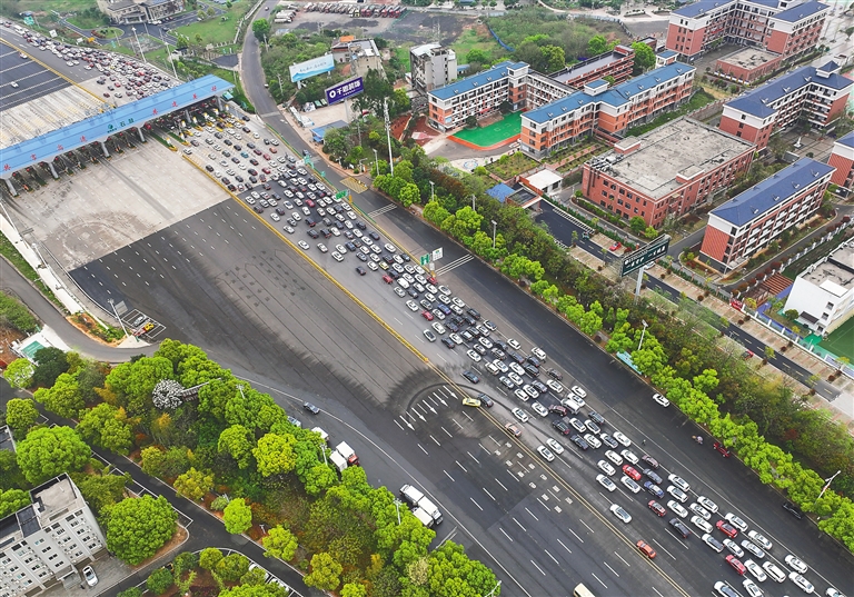 4月4日,在湖南省衡阳市石鼓高速路入口处,出行的车辆排起了长队(无人机照片)。新华社发(曹正平 摄)
