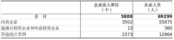 在工业企业法人单位从业人员中,内资企业55875人,占80.6%;其他统计类别12864人,占18.6%(详见表3-1)。