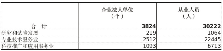 2023年末,全区共有科学研究和技术服务业企业法人单位13824个,从业人员30222人,分别比2018年末增长225.2%和89.2%(详见表5-1)。