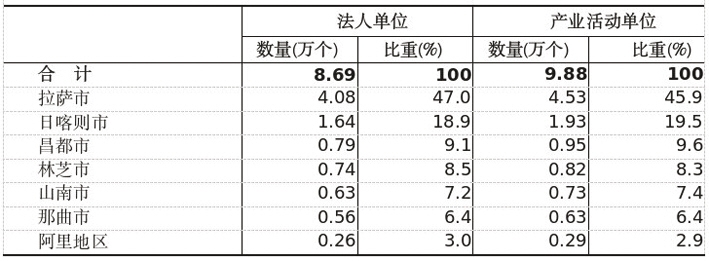 拉萨市拥有第二产业和第三产业产业活动单位14.53万个,占全区第二产业和第三产业产业活动单位数的45.9%;日喀则市1.93万个,占19.5%;昌都市0.95万个,占9.6%;林芝市0.82万个,占8.3%;山南市0.73万个,占7.4%;那曲市0.63万个,占6.4%;阿里地区0.29万个,占2.9%。
