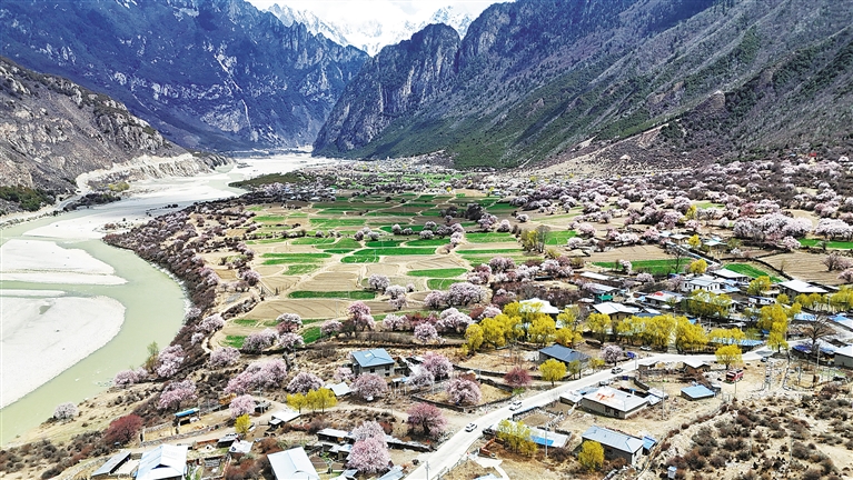 4月的那曲市嘉黎县尼屋乡,春雪初融、桃花灼灼,村落、农田与桃花融为一体,呈现出一派高原和美乡村景象。
