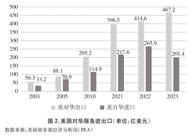 美国服务业产业门类齐全,具有较强国际竞争力。总体来看,随着经济不断发展和人民生活水平提升,中国对服务需求明显扩大,中美双方服务贸易快速增长。据美国商务部统计,2001-2023年,中美服务贸易额由89.5亿美元扩大到668.6亿美元,增长了6倍(图2)。根据中方统计,2023年,美国是中国第二大服务贸易伙伴;据美方统计,中国是美国第五大服务出口目的地。