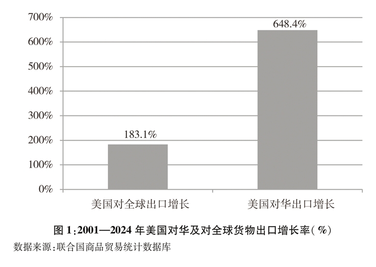美国对华出口增速明显快于其对全球出口。中国加入世界贸易组织以来,美国对华出口快速增长,中国成为美国重要的出口市场。根据联合国统计数据,2024年美国对华货物出口额1435.5亿美元,较2001年的191.8亿美元增长648.4%,远远高于同期美国对全球183.1%的出口增幅(图1)。