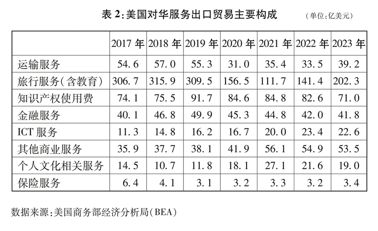 美国是中国服务贸易最大逆差来源地,逆差规模总体呈现扩大趋势。据美国商务部统计,2001-2023年,美国对华服务出口额由56.3亿美元扩大到467.1亿美元,增长了7.3倍;美国对华服务贸易年度顺差扩大11.5倍至265.7亿美元(图2),2019年时更是高达397亿美元。2023年,中国仍是美国服务贸易顺差最大来源国,占美国服务贸易顺差总额的9.5%左右,中国对美服务贸易逆差主要集中在旅行(含教育)、知识产权使用费和运输服务三个领域(表2)。