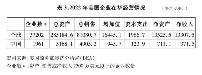 中美经贸合作为美国企业创造了大量商机和利润(表3)。中国拥有庞大的市场和不断升级的消费需求,例如,特斯拉在中国销量持续增长,2024年销量超过65.7万辆,同比增长8.8%,创下历史最高水平。十余家美资保险公司在华设有分公司。高盛、运通、美国银行、美国大都会人寿等美国金融机构作为中国金融机构的战略投资者,均取得了不菲的投资收益。美国商务部2024年8月的统计显示,2022年美国在华企业(拥有多数股权且资产、销售或净收入2500万美元以上)共1961家,总销售额4905.2亿美元,同比增长4.3%。
