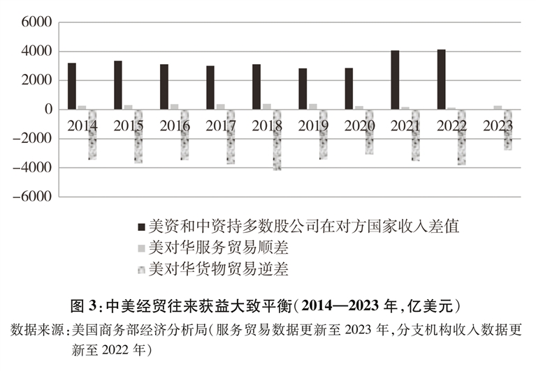 中美经贸往来获益大致平衡。客观认识和评价中美双边贸易是否平衡,需要全面深入考察,不能只看货物贸易差额。在经济全球化深入发展、国际化生产普遍存在的今天,双边经贸关系内涵早已超出货物贸易范围,服务贸易和本国企业在对方国家分支机构的本地销售额(即双向投资中的本地销售)也应纳入。综合考虑货物贸易、服务贸易和本国企业在对方国家分支机构的本地销售额三项因素,中美双方经贸往来获益大致平衡(图3)。