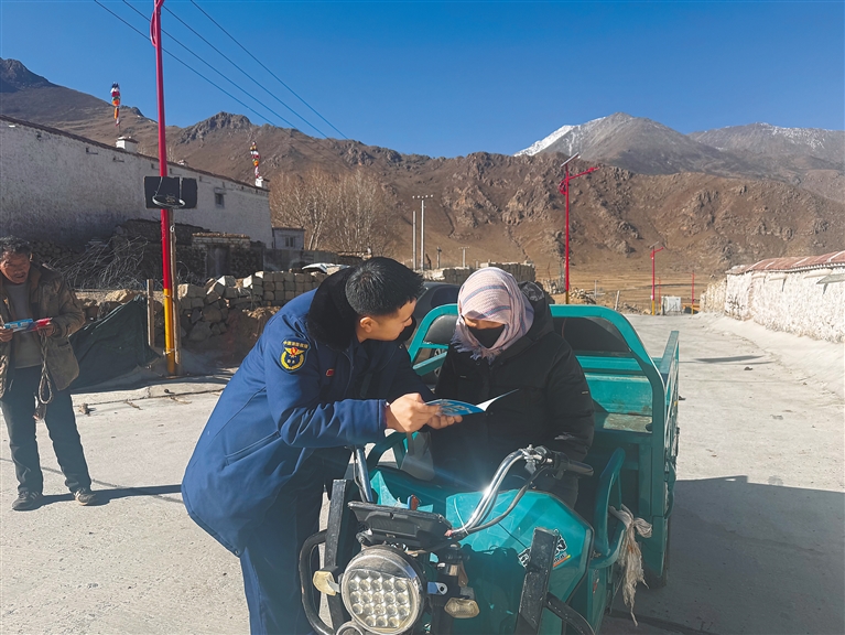 图为拉萨市消防救援支队宣传员向古荣乡朗巴村村民讲解消防安全知识。本报通讯员 梁诗敏 旦增卓嘎 次仁央宗 摄