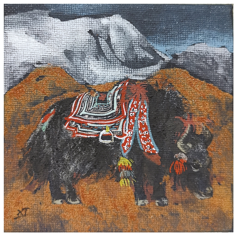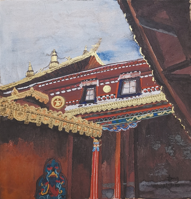 她画笔下描绘的古城拉萨、朵朵白云、一草一木、民居建筑和人物形象都融入了对于藏文化的理解和对西藏美好生活的热爱之情。她将这些景象都转化为自己的艺术语言并赋予在了一层层传统麻纸之上。在她的创作世界里,艺术是一场结合了研究的探索,是一场永不停歇的心灵对话,她希望一直能用自己的艺术语言坚持传统绘画方式,不断摹古继新。