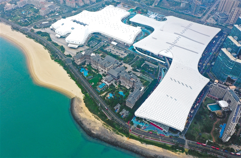 图为4月10日拍摄的第五届中国国际消费品博览会主会场海南国际会展中心(无人机照片)。新华社记者 郭程 摄