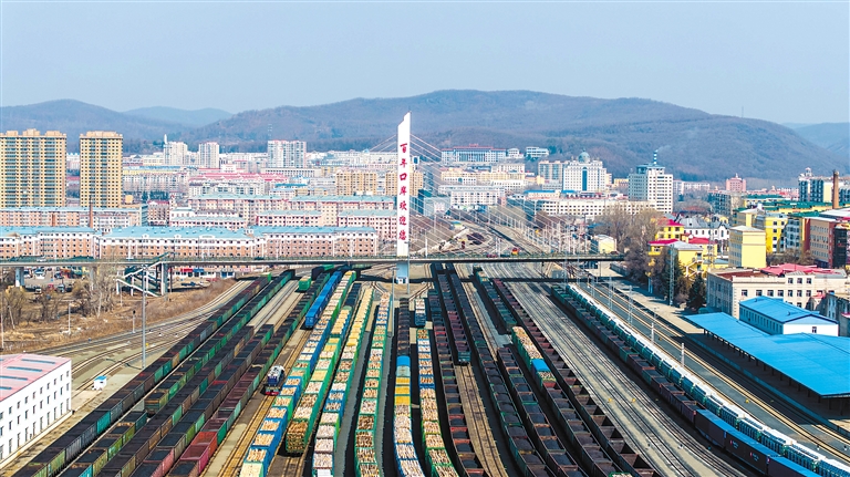图为4月10日,货物列车停靠在中国铁路哈尔滨局集团有限公司绥芬河站南场等待解体换装(无人机照片)。新华社发(曲艺伟 摄)