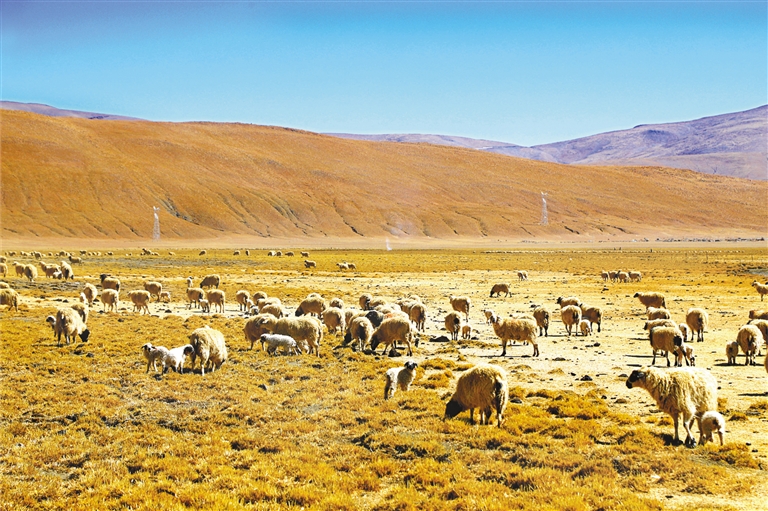 哲古草原上,羊群正悠闲地吃草。牧民旦增怀里抱着一只小羊坐在路边,轻柔地抚摸着。“这是我们牧民的希望啊。”他的脸上洋溢着收获的喜悦。