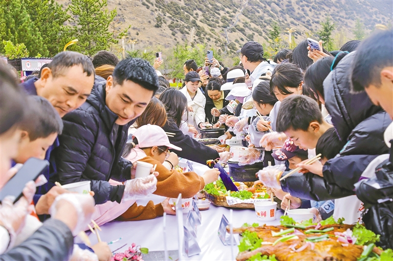 图为在活动现场,市民和游客品尝林芝特色菜。