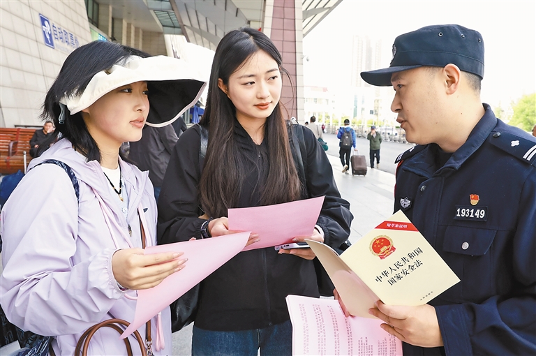 图为4月13日,武汉铁路公安局民警在湖北省武昌站为游客讲解国家安全知识。 新华社发(赵军 摄)