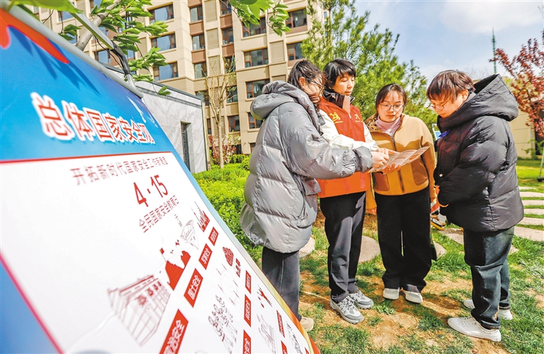 图为4月13日,河北省遵化市华明路街道志愿者给居民讲解全民国家安全知识。 新华社发(刘满仓 摄)