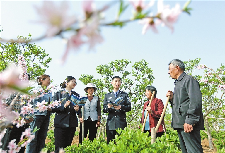 图为4月13日,在山东省临沂市平邑县武台镇孙家庄村,民警在田间为村民讲解国家安全相关知识。新华社发(武纪全 摄)