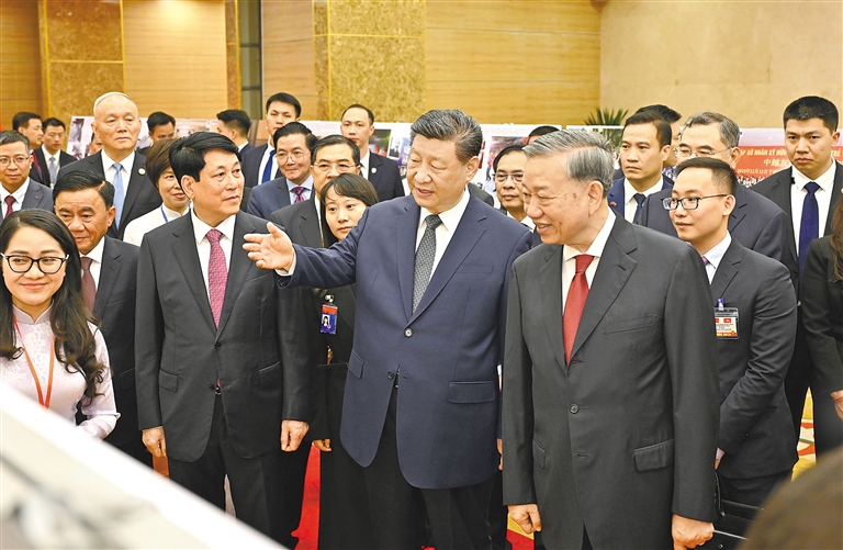 4月15日上午,中共中央总书记、国家主席习近平在河内国际会议中心同越共中央总书记苏林、越南国家主席梁强共同会见中越人民大联欢活动代表。这是活动前,习近平在苏林、梁强陪同下,观看中越建交75周年图片展。 新华社记者 殷博古 摄