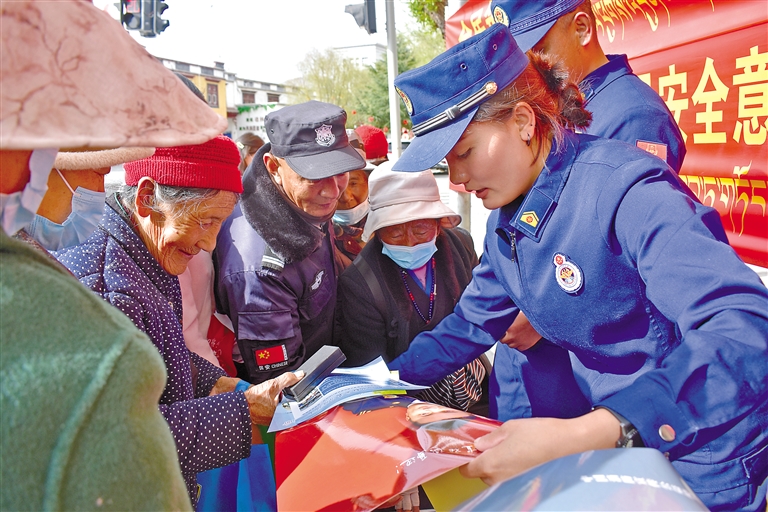 4月15日,山南市琼结县组织开展第十个全民国家安全教育日系列宣传活动。 图为琼结县消防救援大队工作人员向群众发放宣传资料。 本报记者 孙开远 摄