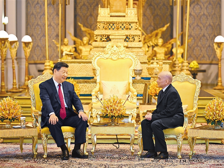 新华社金边4月17日电(记者 倪四义 李凯 吴长伟)4月17日下午,柬埔寨国王西哈莫尼同中国国家主席习近平在金边王宫举行会见。