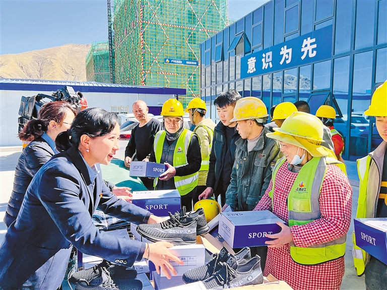 近日,西藏银行组织工作人员前往拉萨高新区标准化厂房(二期)项目工地,慰问一线建设者,送上近千件鞋子、衣物等生活用品。