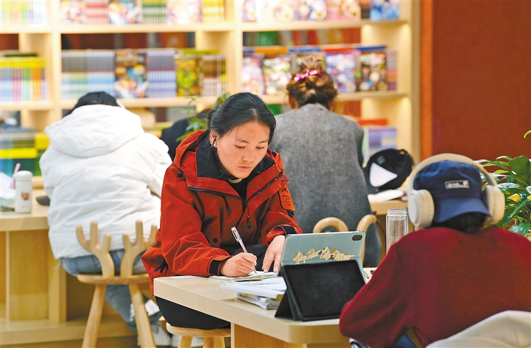 图为读者在书店一边查阅资料一边做笔记。 本报记者 洛桑 摄