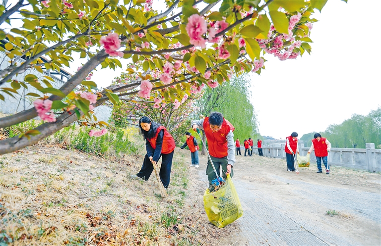 图文娱河北省遵化市兴旺寨镇志愿者在当地一处景区捡拾杂物。新华社发(刘满仓 摄)