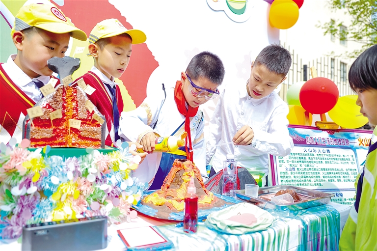 图为山东青岛浮山路小学学生在“珍爱地球”科普活动中体验“火山爆发”科学实验。 新华社发(张鹰 摄)
