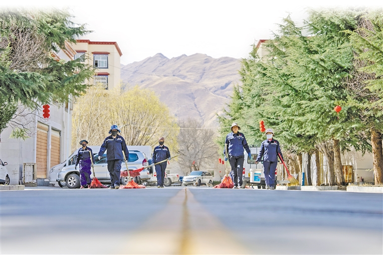 图③:物业服务部保洁团队在清扫小区道路。 本报记者 阿旺尼玛 摄