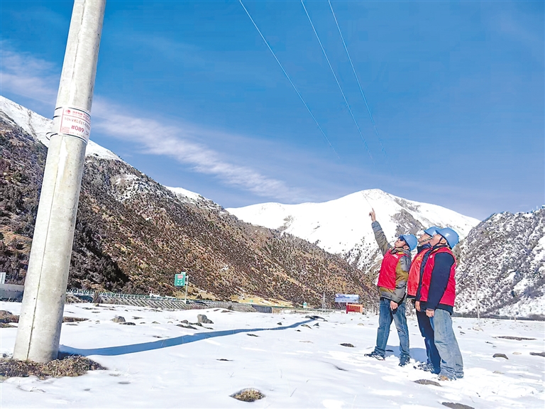 图为国网工布江达县供电公司工作人员在检查线路。 本报记者 刘枫 谢筱纯 本报通讯员 多吉旺堆 张民泽 摄
