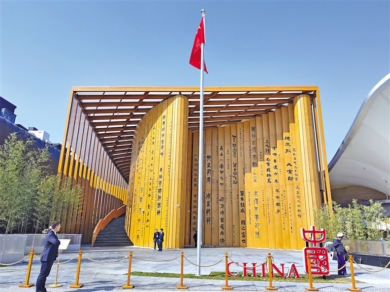 中国馆以“共同构建人与自然生命共同体——绿色发展的未来社会”为主题,向参观者呈现绿水青山、崇尚自然的美丽中国,展望人与自然和谐共生的未来社会。