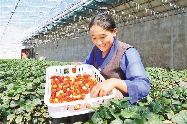 图为拉萨市尼木县吞弥现代农业产业园区草莓大棚内,工作人员在采摘草莓。