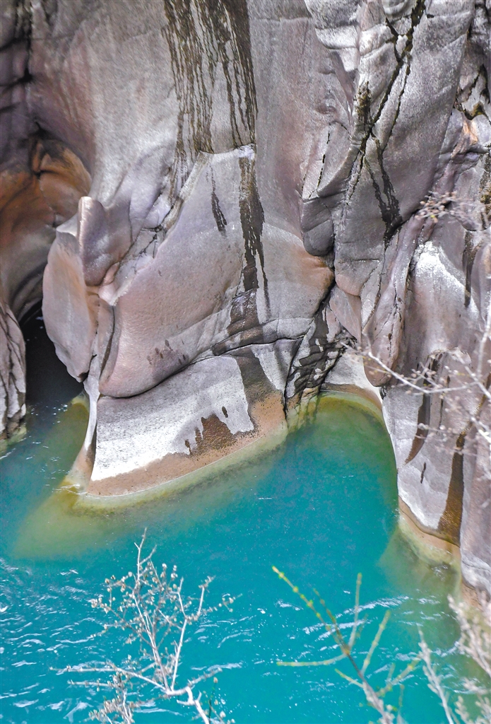 在丙察察公路接近察隅县城的位置,国道219线与559线交汇点,有一处由水流反复冲刷激荡出的地质奇观——水磨岩。