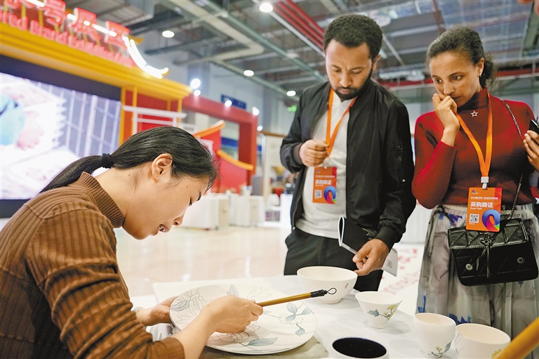 图为4月27日,参展商(左)在活动现场给瓷器上色。 新华社记者 薛宇舸 摄