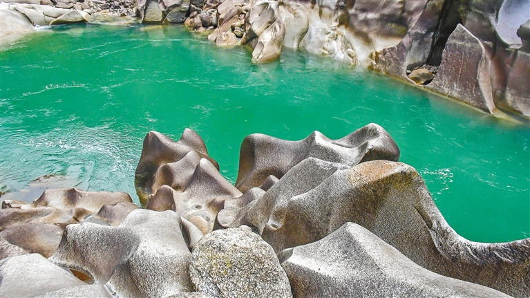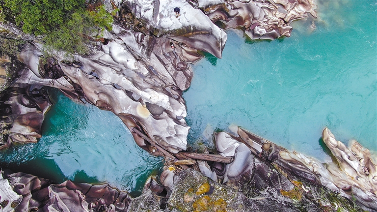 在丙察察公路接近察隅县城的位置,国道219线与559线交汇点,有一处由水流反复冲刷激荡出的地质奇观——水磨岩。