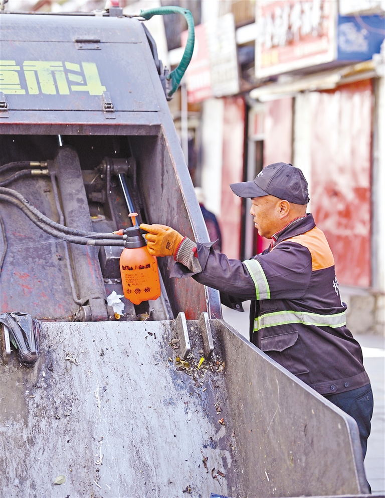 图为环卫工人在拉萨市城关区吉崩岗街道策门林社区小巷清洁垃圾车。 本报记者 唐斌 摄