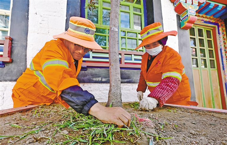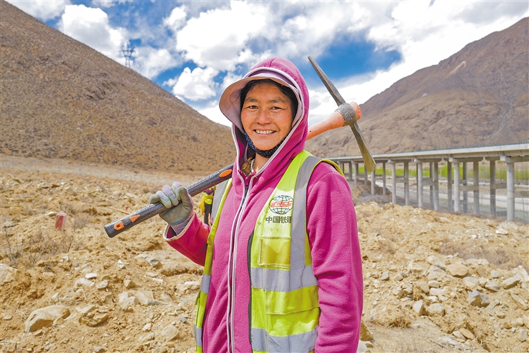 图为中国铁建二十一局的工人参与植树活动。本报记者 丹增群培 摄