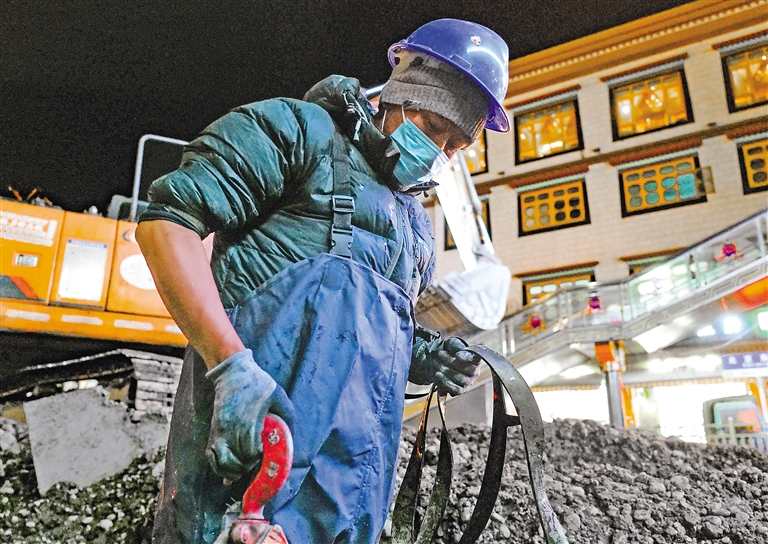 图为工人在拉萨市政建设工地上工作。 本报记者 丹增群培 摄