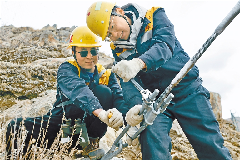 图为青藏集团拉萨基础设施段变配电运行车间桑日供电运行工区的职工巡检电力架空线路设备。 本报记者 旦增兰泽 本报通讯员 赵风斌 拉巴次仁 摄