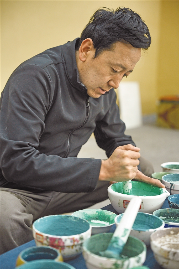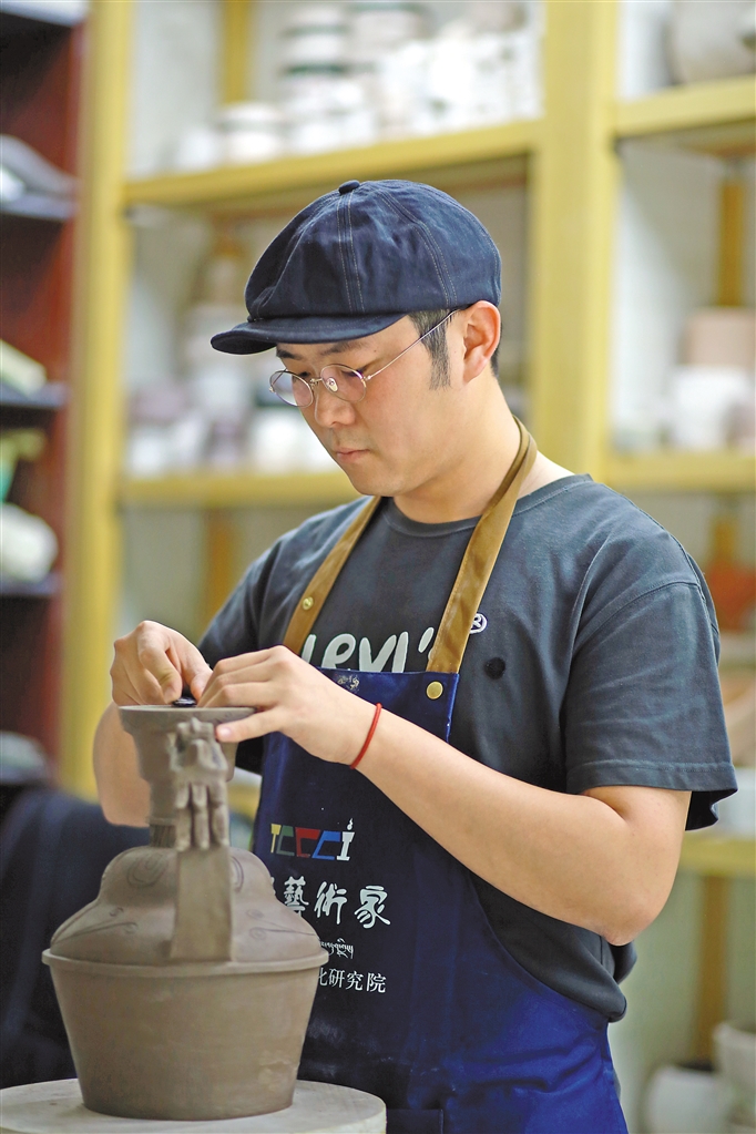 图为雪堆白技工学校陶瓷工作室老师王竹在进行藏式器皿的设计与制作。