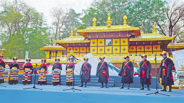 图为5月1日,“日光之城·乐唱林卡荟”第二季在拉萨罗布林卡上演,主体演出以篇章式呈现西藏七市地独特音乐文化,同时设置沉浸式文化体验区。图为山南市贡嘎县朗杰雪民间艺术队表演谐钦《碧兴达吉》。 本报记者 格桑伦珠 摄