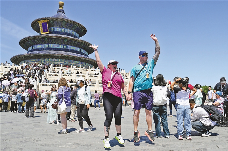 5月1日,来自澳大利亚的游客在北京天坛公园祈年殿前留影。新华社记者 鞠焕宗 摄