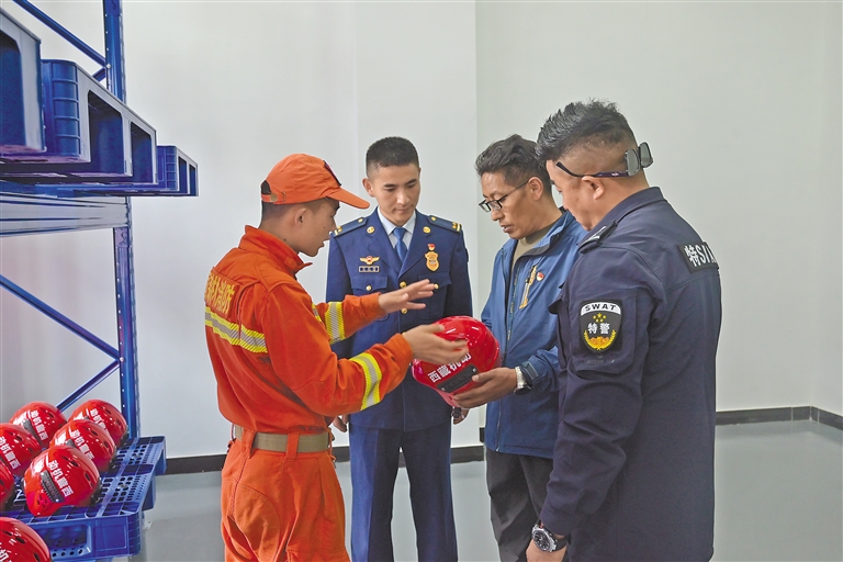 林芝市波密县森林消防中队消防员向县公安局民警讲解消防设备使用方法。 本报记者 谢筱纯 刘枫 本报通讯员 晋美 摄