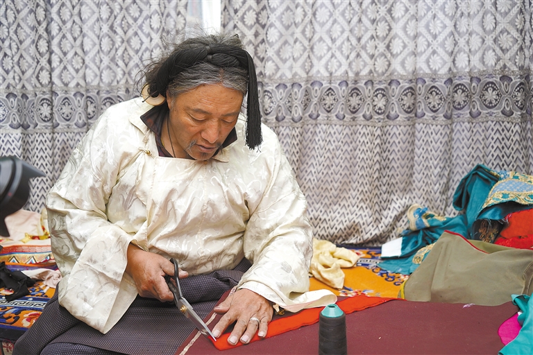 “新衣服老大穿,穿旧了给老二,缝缝补补给老三。”次欧打趣道,“在以前生活相对拮据的时候,有了这门手艺,家里人即使穿着补丁衣服,御寒倒是不用担心了。随着缝纫手艺越来越精湛,我会用旧的布料为家人制作合身的藏装,渐渐地,街坊邻居也会上门找我做衣服,自此我也吃上了‘手艺饭’。”