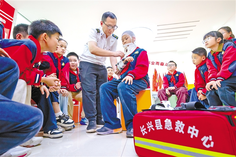 图为浙江省湖州市长兴县急救中心红十字工作者在长兴县第二实验小学为学生演示创伤救护。