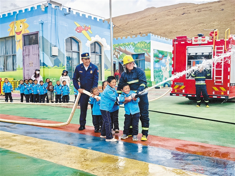 近日,西藏消防救援总队的队员驾驶着红色消防车来到日喀则市定日县扎西宗乡班定村幼儿园,为师生们带来了一堂别开生面的消防安全体验课。