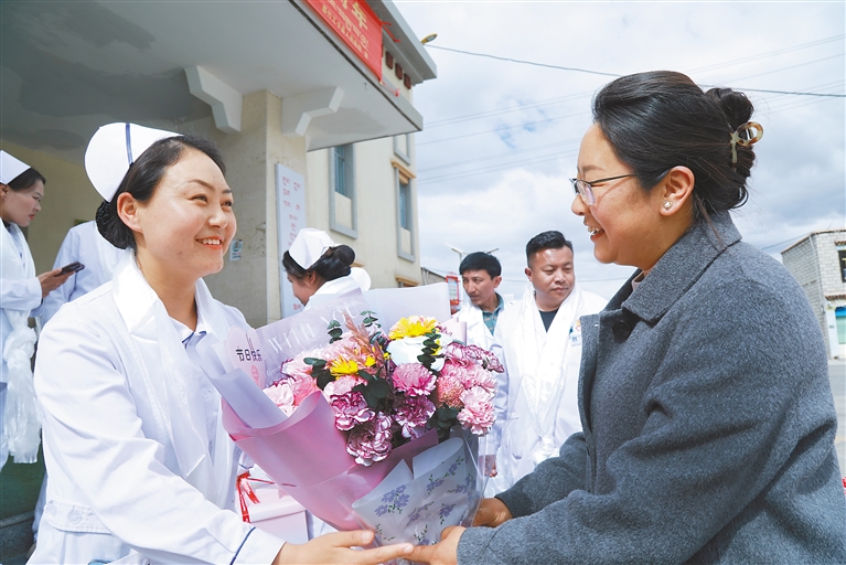 图为在“5·12”国际护士节到来之际,拉萨市墨竹工卡县总工会在墨竹工卡县人民医院开展慰问活动。图为墨竹工卡县总工会负责同志为县人民医院护士送上鲜花。本报记者 格桑伦珠 摄