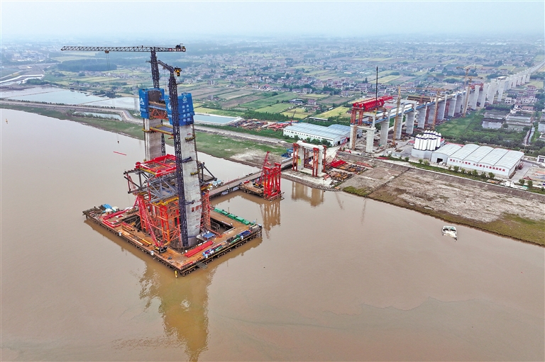 目前,由中铁大桥局承建的崇启公铁长江大桥南、北主塔进入施工冲刺阶段,500余名建设者奋战在作业现场。崇启公铁长江大桥是沪渝蓉高速铁路全线重点控制性工程,大桥全长4.09公里,横跨长江北支,是江苏启东与上海崇明的主要连接通道。 图为5月15日拍摄的崇启公铁长江大桥建设现场(无人机照片)。 新华社记者 季春鹏 摄