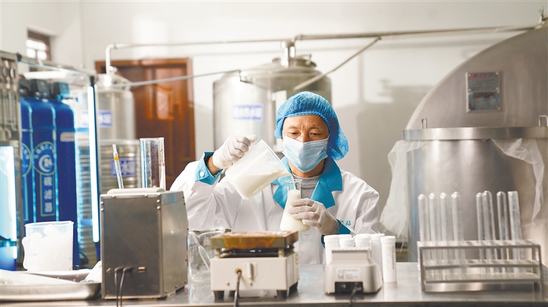 近年来,墨竹工卡县充分发挥斯布村区位优势,通过成立合作社等,推动奶制品加工销售,实现群众增收致富。 图为墨竹工卡县扎西岗乡斯布村奶制品加工站的工作人员检测牛奶。 本报通讯员 洛克 摄