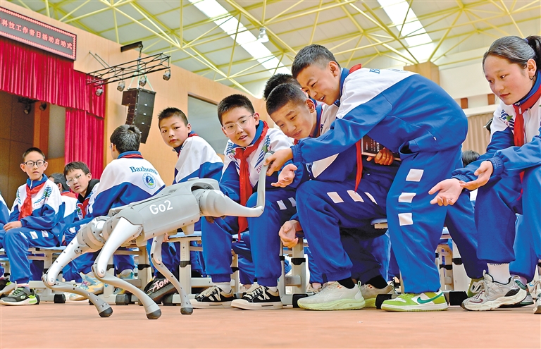 图为拉萨市第八中学学生在与机器狗互动。本报记者 唐斌 摄