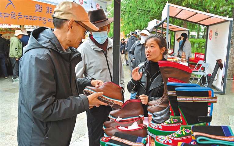 近日,“雪域古城·圣地拉萨”文化旅游节非遗主题活动在拉萨宗角禄康公园内开展,现场人潮涌动。非遗藏戏演员身着华服,以高亢唱腔演绎《朗萨雯蚌》选段,观众围坐沉浸于雪域艺术魅力。非遗展销区陈列着木雕、牛皮制品等传统手工艺品。活动全面展现了非遗保护传承与利用的新进展和新成效。